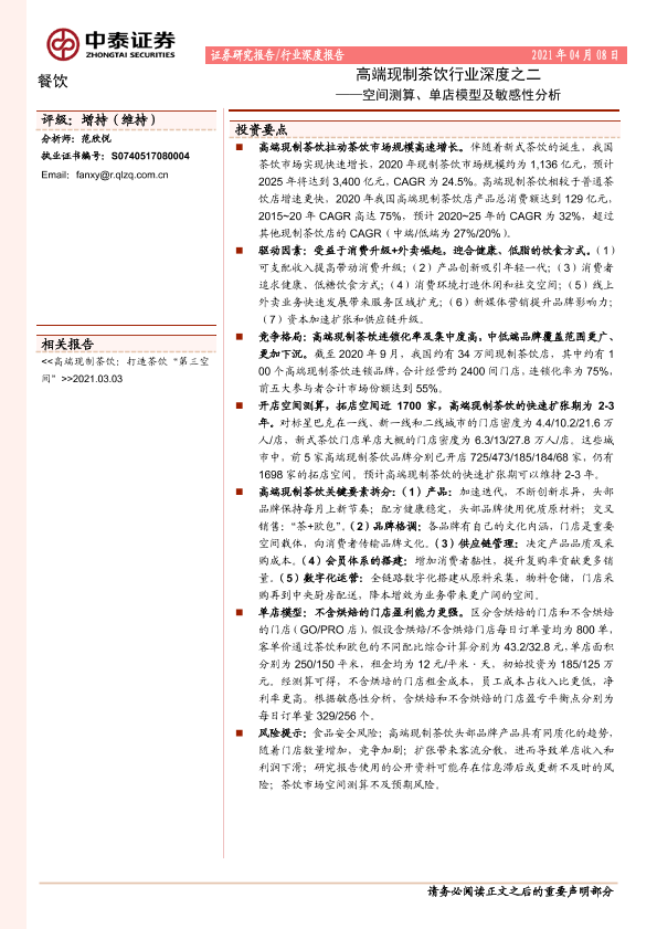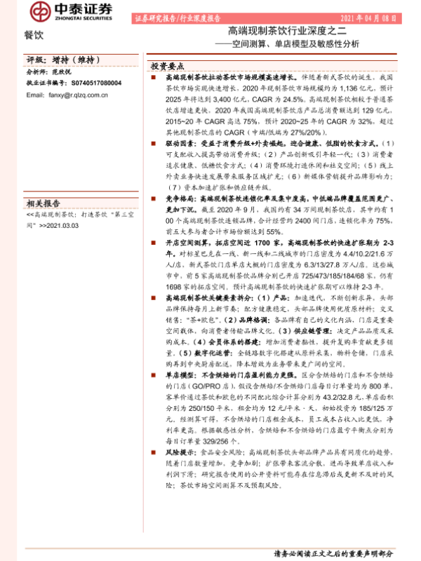 【中泰证券】【20210408】高端现制茶饮行业深度之二:空间测算、单店模型及敏感性分析-30页