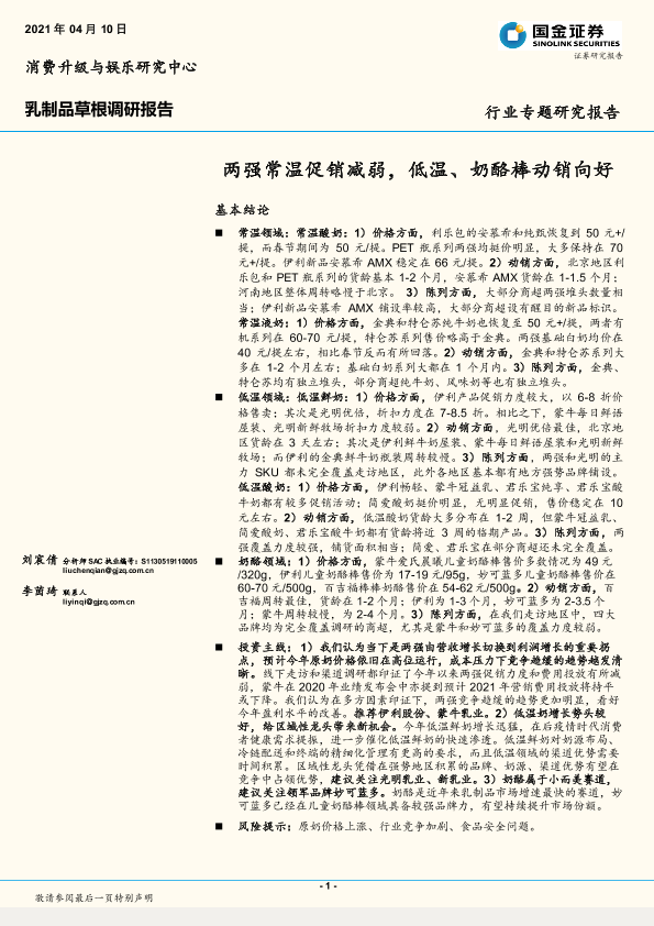 【国金证券】【20210410】20210410-国金证券-乳制品草根调研报告:两强常温促销减弱,低温、奶酪棒动销向好-13页