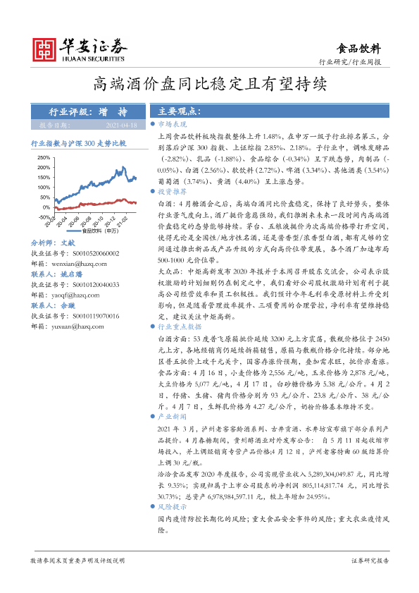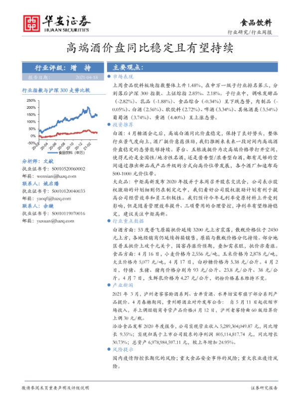 【华安证券】【20210418】20210418-华安证券-食品饮料行业周报:高端酒价盘同比稳定且有望持续-24页