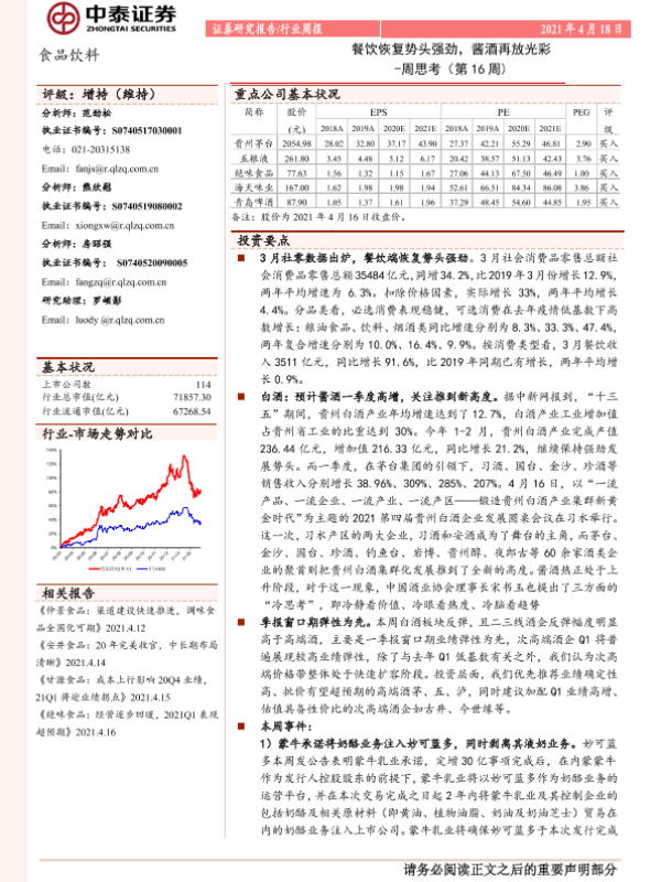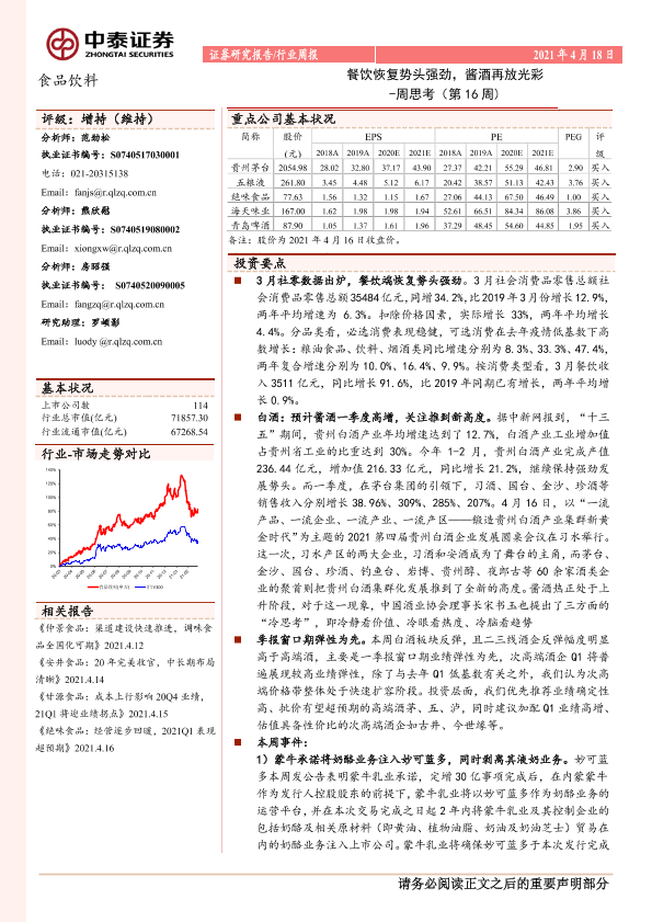 【中泰证券】【20210418】食品饮料行业周思考(第16周) 餐饮恢复势头强劲,酱酒再放光彩-13页
