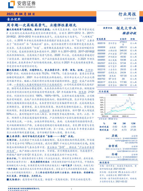 【安信证券】【20210418】食品饮料周专题:次高端高景气,业绩弹性最领先-23页