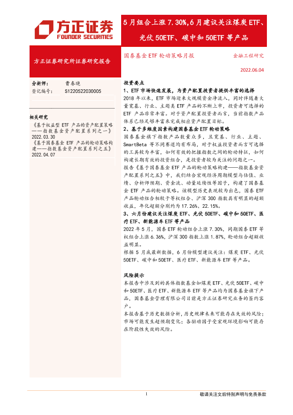 【方正证券】【20220604】国泰基金ETF轮动策略月报:5月组合上涨7.30%,6月建议关注煤炭ETF、光伏50ETF、碳中和50ETF等产品-24页