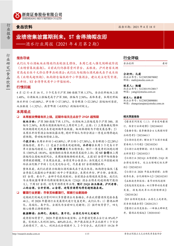 【浙商证券】【20210418】20210418-浙商证券-酒水行业周报:业绩密集披露期到来,ST舍得摘帽在即-15页