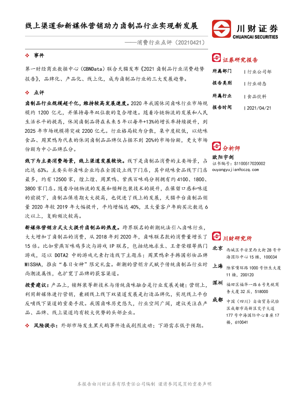 【川财证券】【20210421】消费行业点评:线上渠道和新媒体营销助力卤制品行业实现新发展-2页