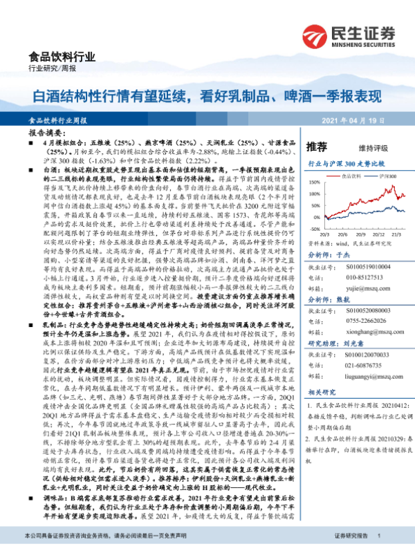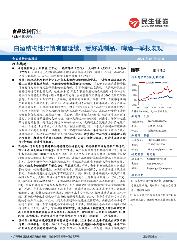 【民生证券】【20210419】20210419-民生证券-食品饮料行业周报:白酒结构性行情有望延续,看好乳制品、啤酒一季报表现-51页