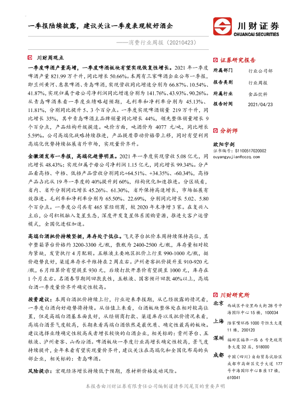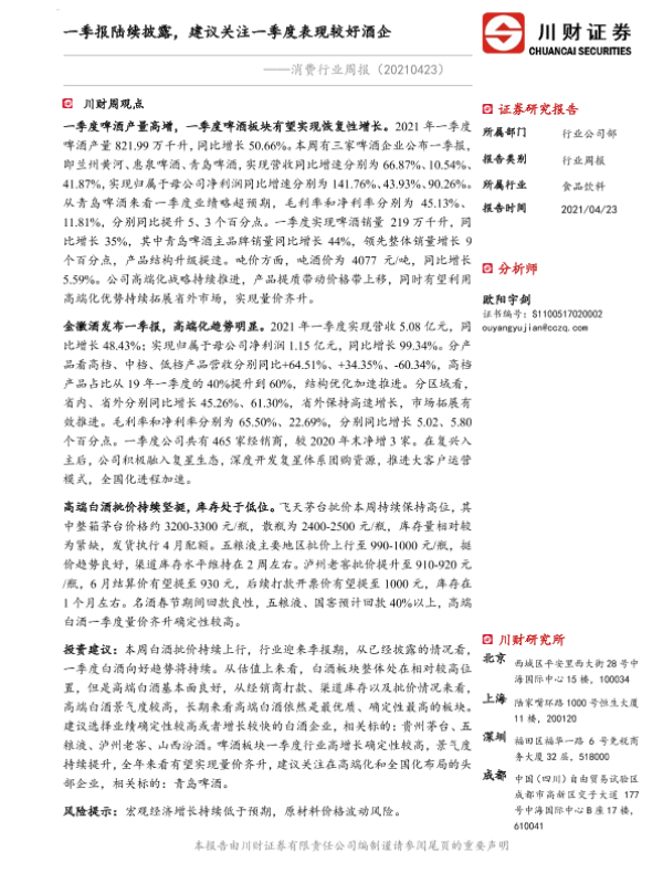 【川财证券】【20210423】20210423-川财证券-消费行业周报:一季报陆续披露,建议关注一季度表现较好酒企-12页