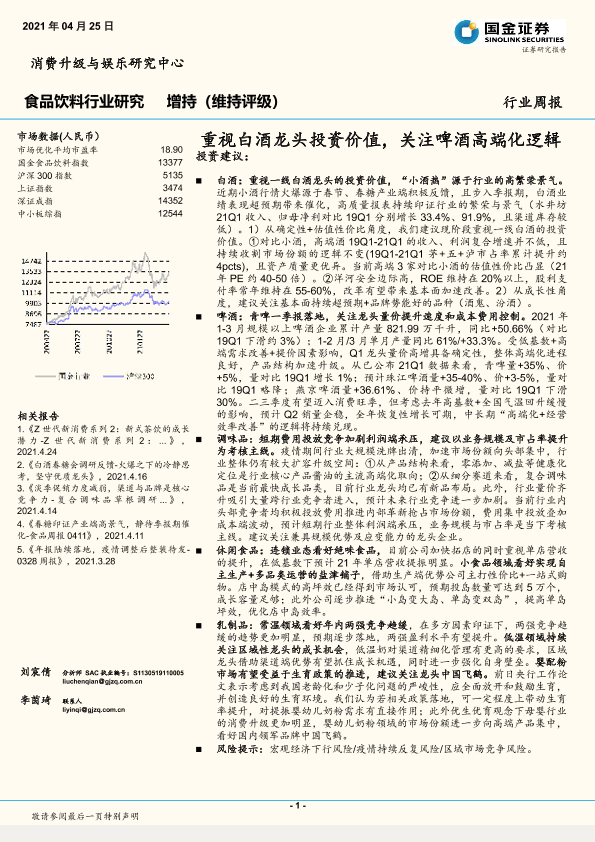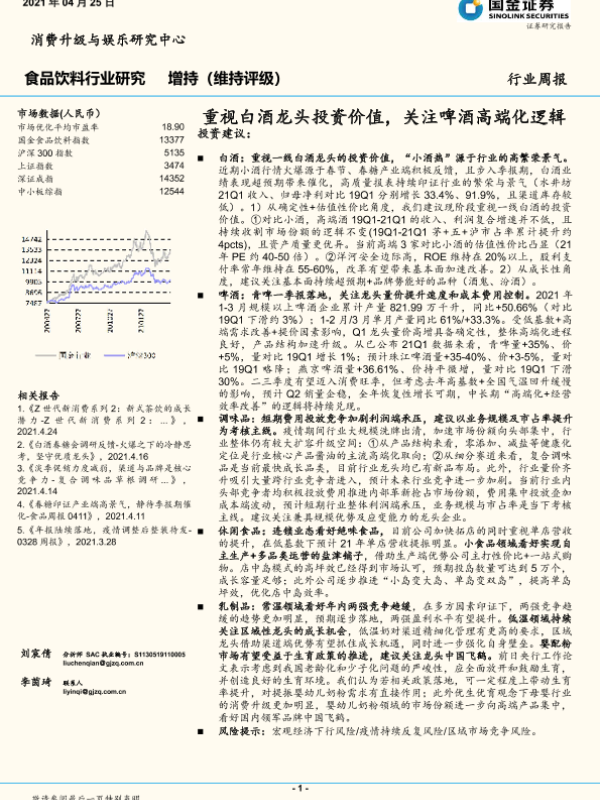 【国金证券】【20210425】20210425-国金证券-食品饮料行业研究周报:重视白酒龙头投资价值,关注啤酒高端化逻辑-16页