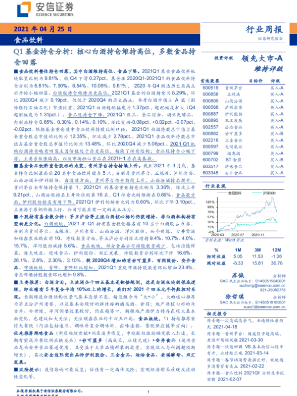 【安信证券】【20210425】20210425-安信证券-食品饮料行业周报:Q1基金持仓分析:核心白酒持仓维持高位,多数食品持仓回落-20页