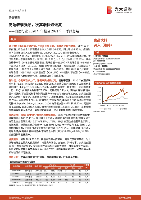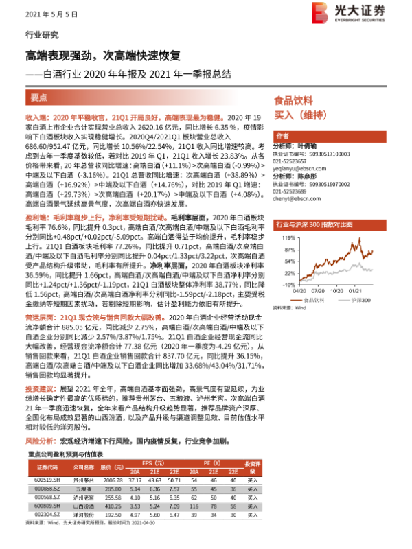 【光大证券】【20210505】白酒行业2020年年报及2021年一季报总结:高端表现强劲,次高端快速恢复-14页