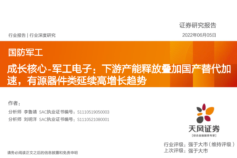 【天风证券】【20220605】国防军工行业行业深度研究:成长核心_军工电子,下游产能释放叠加国产替代加速,有源器件类延续高增长趋势-23页