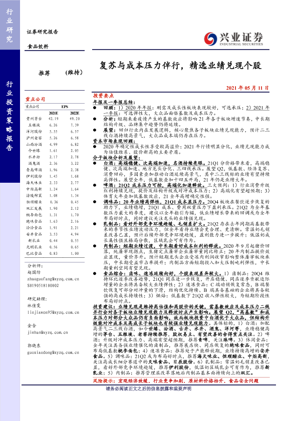 业绩兑现 成本压力 投资建议 行业分析 食品饮料