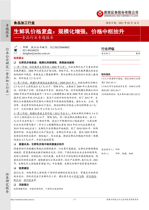 【浙商证券】【20210514】20210514-浙商证券-食品行业专题报告:生鲜乳价格复盘:规模化增强,价格中枢抬升-7页