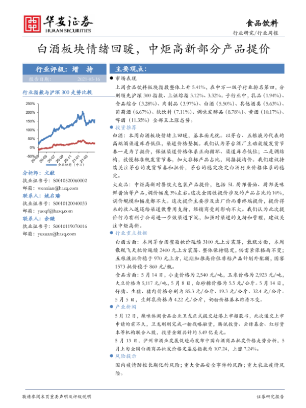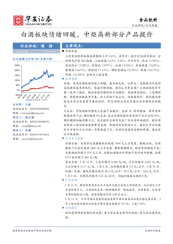 【华安证券】【20210516】20210516-华安证券-食品饮料行业周报:白酒板块情绪回暖,中炬高新部分产品提价-25页