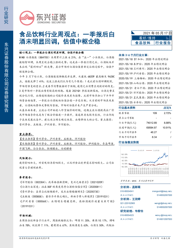 【东兴证券】【20210517】食品饮料行业周观点:一季报后白酒未明显回调,估值中枢企稳-9页