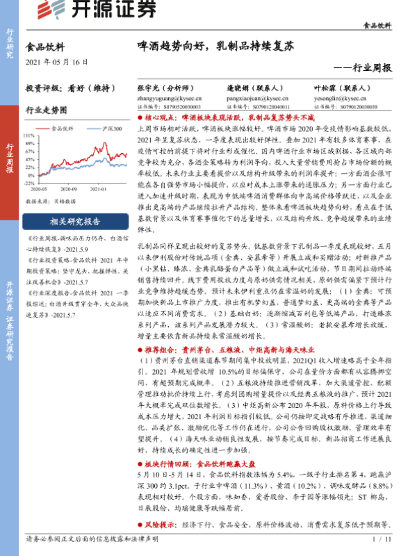 【开源证券】【20210516】食品饮料行业周报:啤酒趋势向好,乳制品持续复苏-11页
