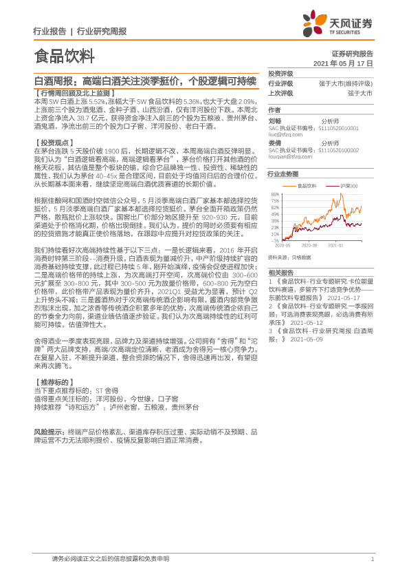【天风证券】【20210517】20210517-天风证券-白酒周报:高端白酒关注淡季挺价,个股逻辑可持续-7页