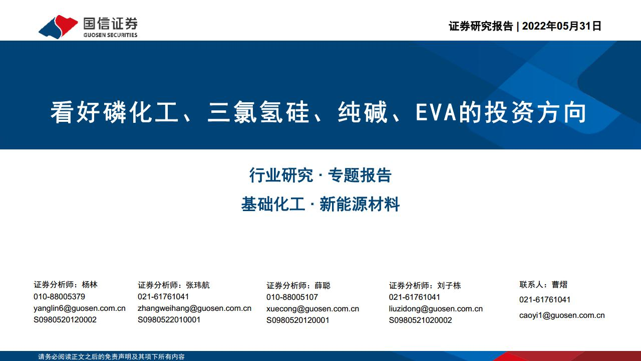 【国信证券】【20220531】基础化工·新能源材料行业专题报告:看好磷化工、三氯氢硅、纯碱、EVA的投资方向-41页
