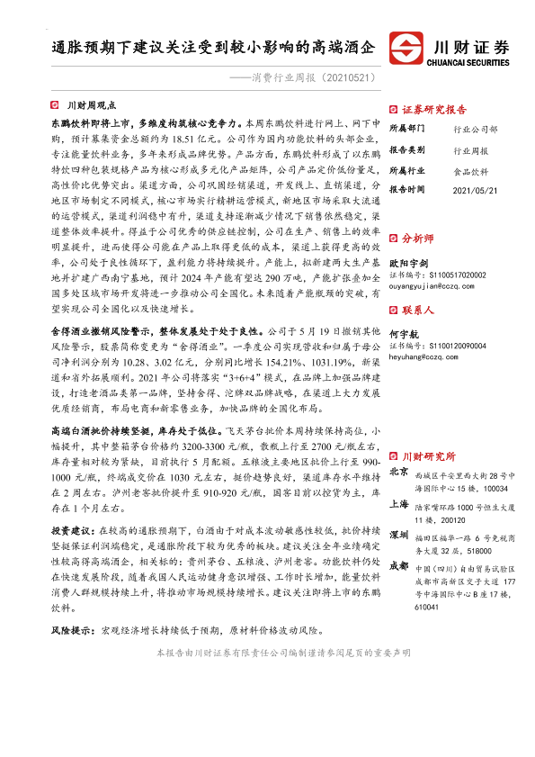 【川财证券】【20210521】消费行业周报:通胀预期下建议关注受到较小影响的高端酒企-12页