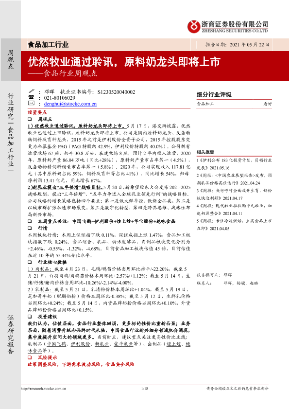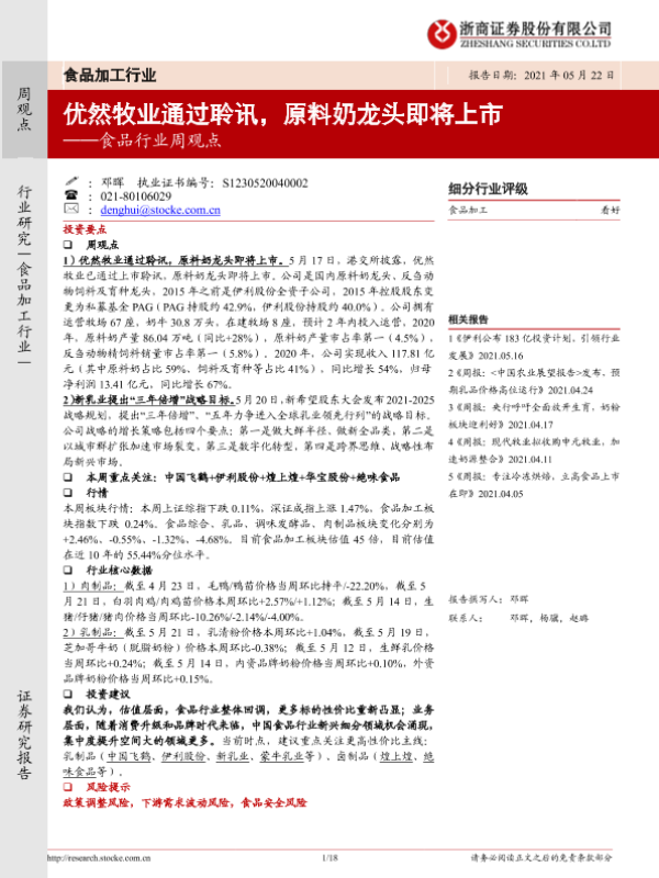 【浙商证券】【20210522】20210522-浙商证券-食品行业周观点:优然牧业通过聆讯,原料奶龙头即将上市-18页