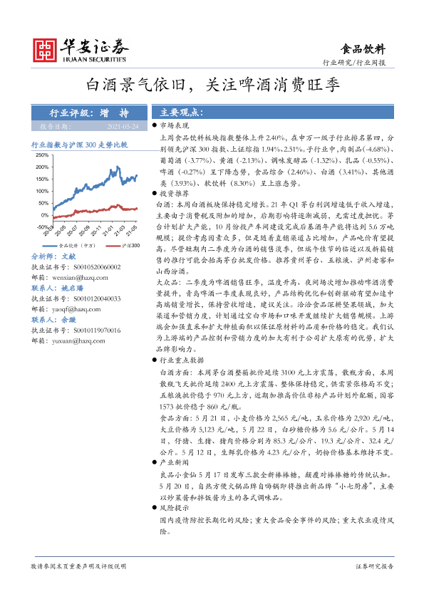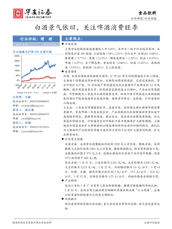 【华安证券】【20210524】20210523-华安证券-食品饮料行业周报:白酒景气依旧,关注啤酒消费旺季-22页