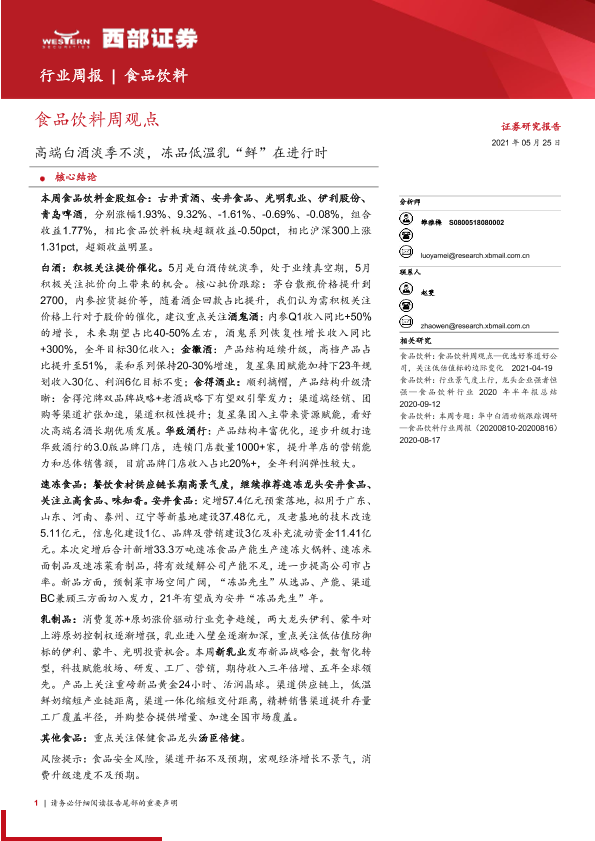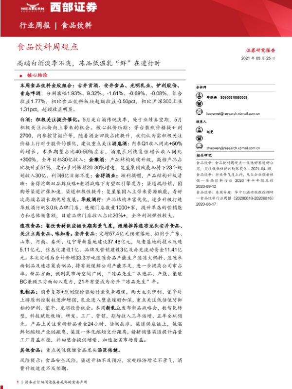 【西部证券】【20210525】20210525-西部证券-食品饮料周观点:高端白酒淡季不淡,冻品低温乳“鲜”在进行时-14页