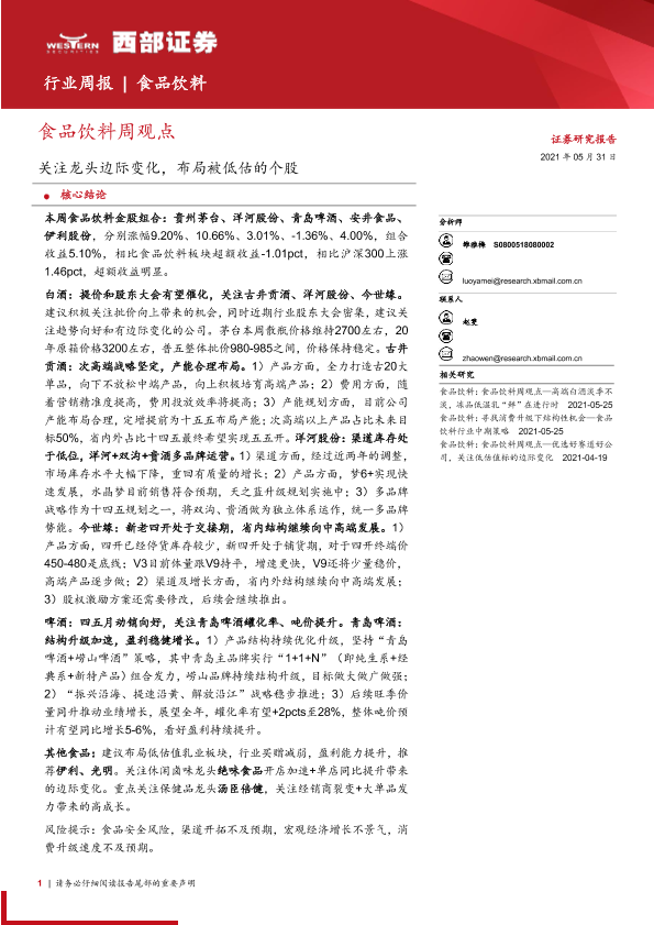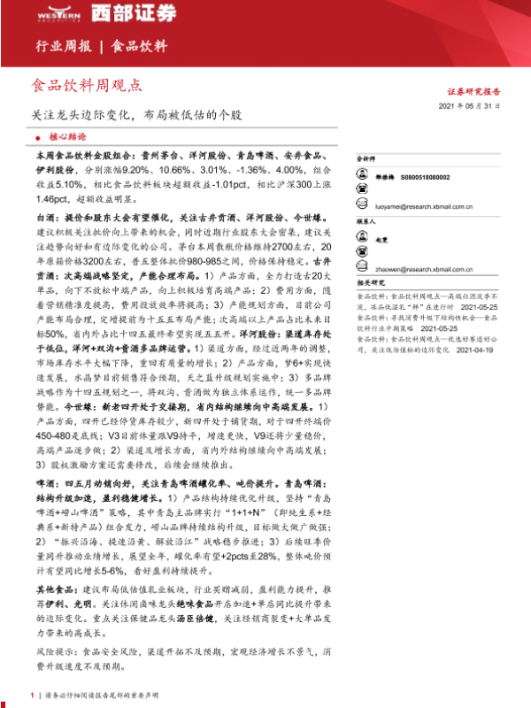 【西部证券】【20210531】食品饮料周观点:关注龙头边际变化,布局被低估的个股-14页