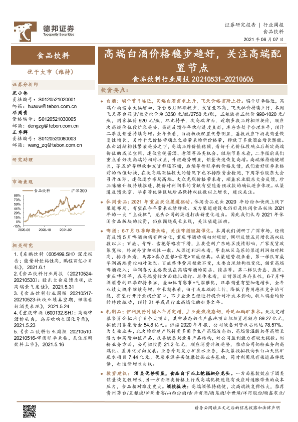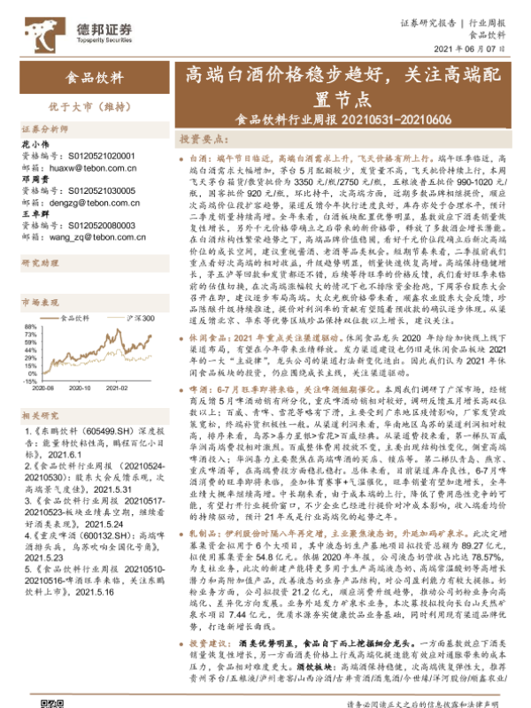【德邦证券】【20210607】20210607-德邦证券-食品饮料行业周报:高端白酒价格稳步趋好,关注高端配置节点-17页