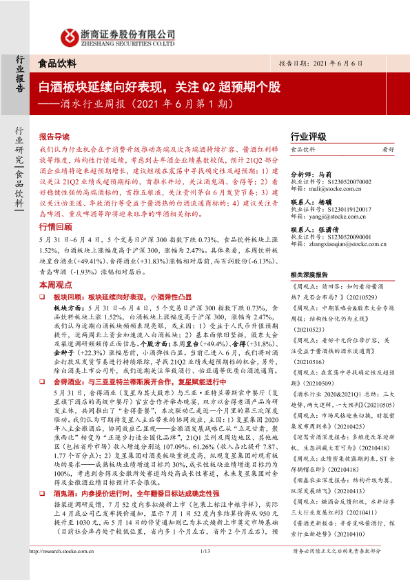 【浙商证券】【20210606】20210606-浙商证券-酒水行业周报(2021年6月第1期):白酒板块延续向好表现,关注Q2超预期个股-13页