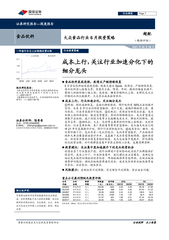【国信证券】【20210609】大众食品行业6月投资策略:成本上行,关注行业加速分化下的细分龙头-17页