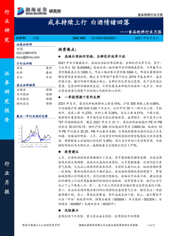 【渤海证券】【20210609】食品饮料行业月报:成本持续上行 白酒情绪回落-15页
