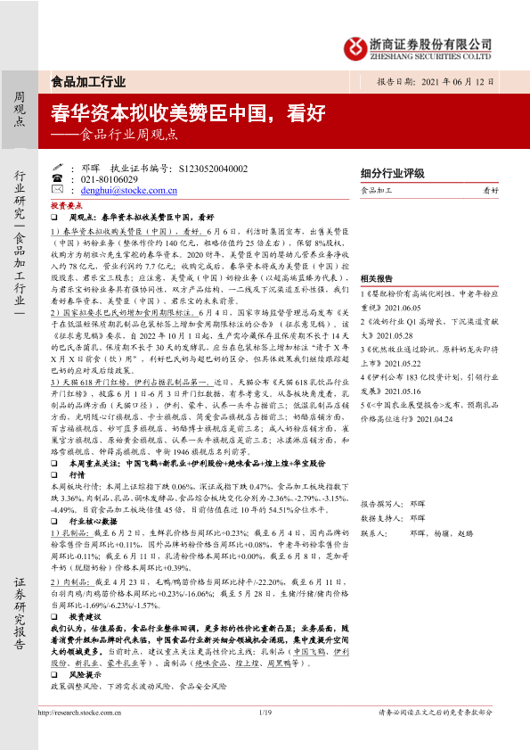 【浙商证券】【20210612】20210612-浙商证券-食品行业周观点:春华资本拟收美赞臣中国,看好-19页