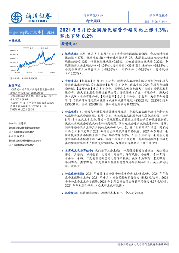 【海通证券】【20210614】20210614-海通证券-食品行业周报:2021年5月份全国居民消费价格同比上涨1.3%,环比下降0.2%-7页