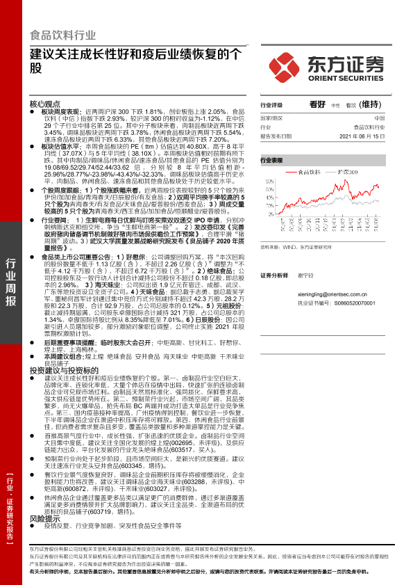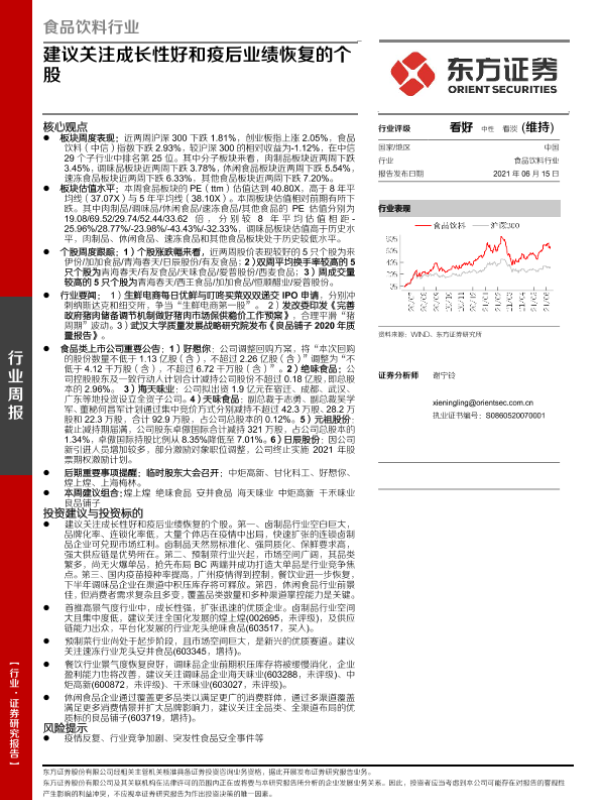 【东方证券】【20210615】20210615-东方证券-食品饮料行业周报:建议关注成长性好和疫后业绩恢复的个股-13页
