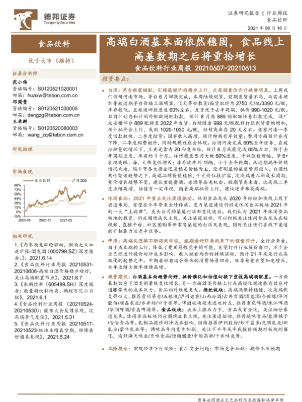 【德邦证券】【20210616】20210616-德邦证券-食品饮料行业周报:高端白酒基本面依然稳固,食品线上高基数期之后将重拾增长-16页