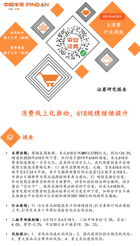 【平安证券】【20210620】大消费行业周报:消费线上化推动,618规模继续提升-4页