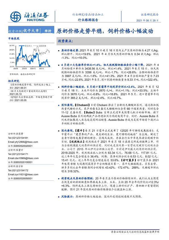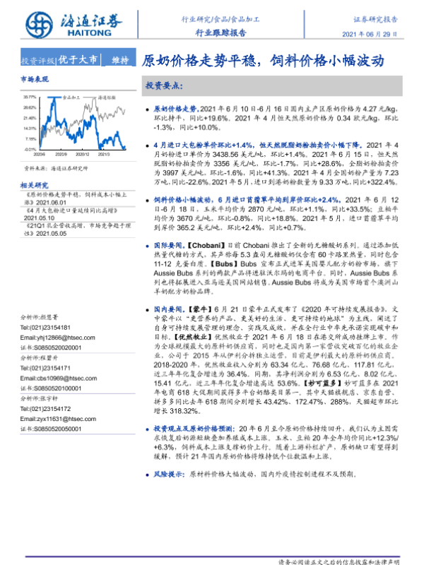 【海通证券】【20210629】20210629-海通证券-食品加工行业跟踪报告:原奶价格走势平稳,饲料价格小幅波动-10页