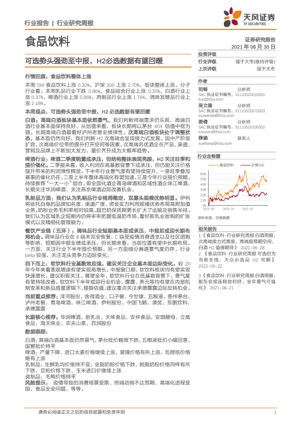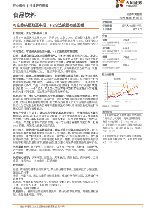 【天风证券】【20210630】食品饮料行业研究周报:可选势头强劲至中报,H2必选数据有望回暖-10页