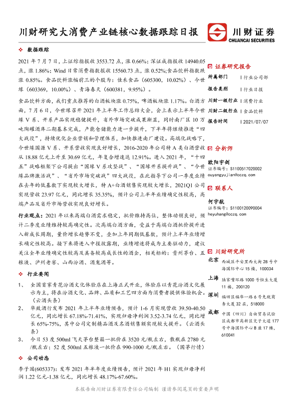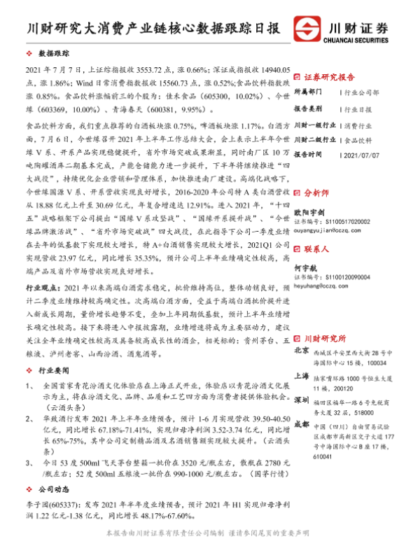 【川财证券】【20210707】食品饮料行业日报:川财研究大消费产业链核心数据跟踪日报-4页