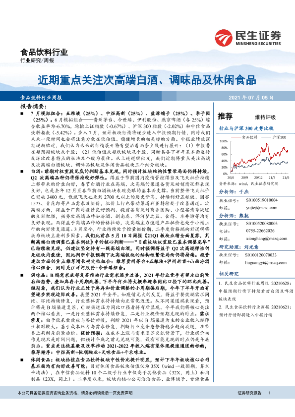 【民生证券】【20210705】20210705-民生证券-食品饮料行业周报:近期重点关注次高端白酒、调味品及休闲食品-45页