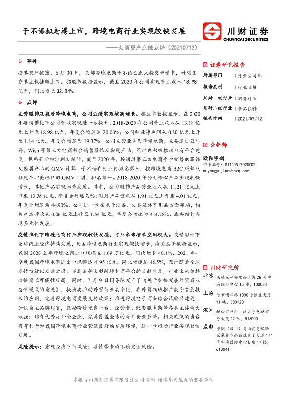 【川财证券】【20210712】大消费产业链点评:子不语拟赴港上市,跨境电商行业实现较快发展-2页