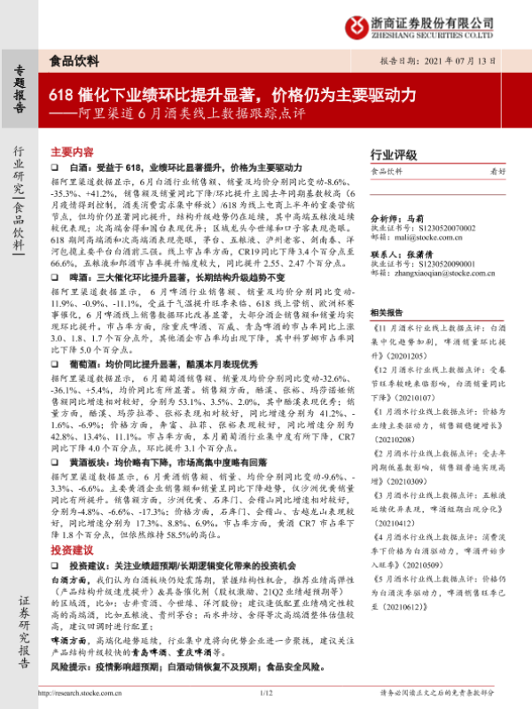 【浙商证券】【20210713】阿里渠道6月酒类线上数据跟踪点评:618催化下业绩环比提升显著,价格仍为主要驱动力-12页