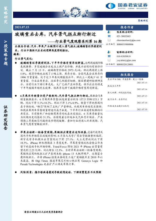【国泰君安证券】【20210715】20210715-国泰君安-行业景气度观察系列第16期:玻璃重启去库,汽车景气拐点渐行渐近-15页