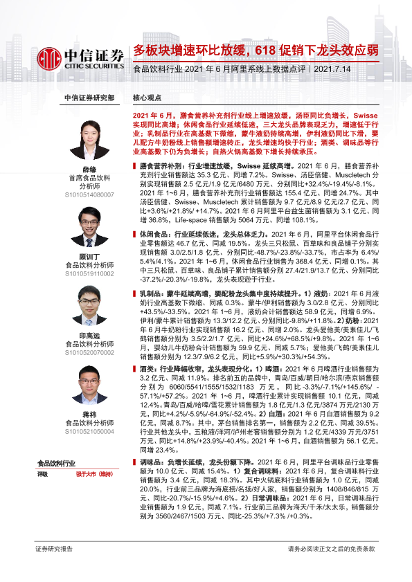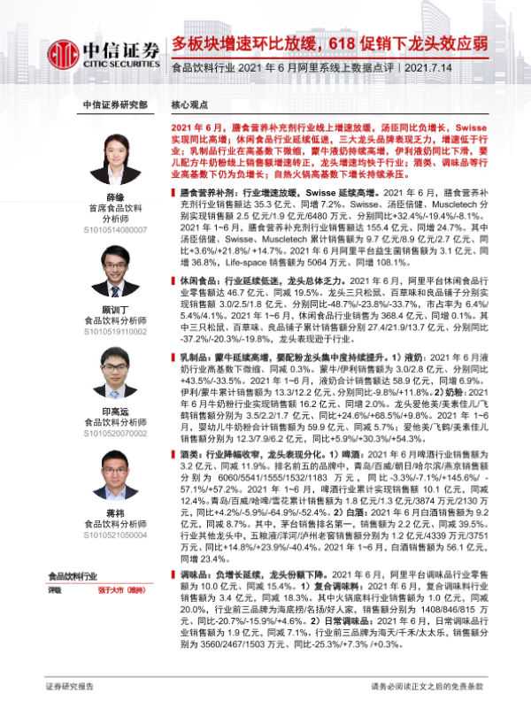 【中信证券】【20210714】食品饮料行业2021年6月阿里系线上数据点评:多板块增速环比放缓,618促销下龙头效应弱-12页