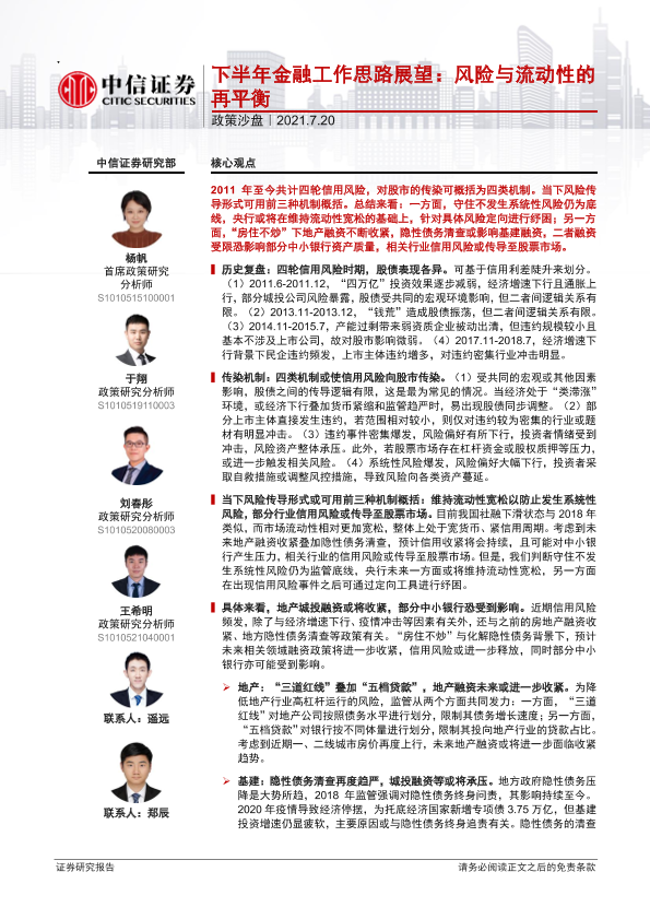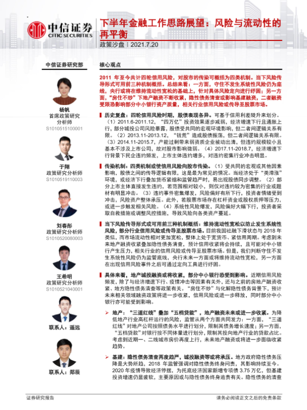 【中信证券】【20210720】政策沙盘:下半年金融工作思路展望,风险与流动性的再平衡-21页