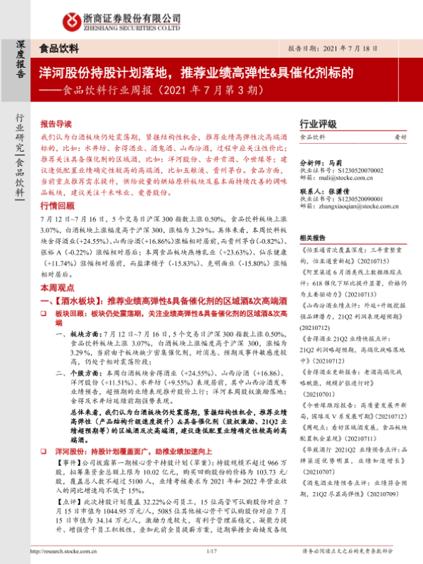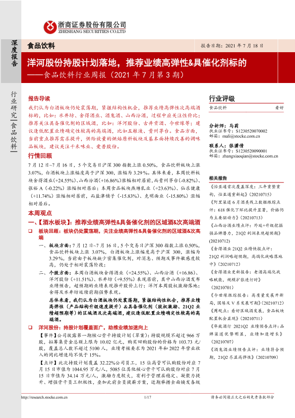 【浙商证券】【20210718】食品饮料行业周报(2021年7月第3期):洋河股份持股计划落地,推荐业绩高弹性&具催化剂标的-17页