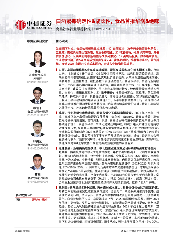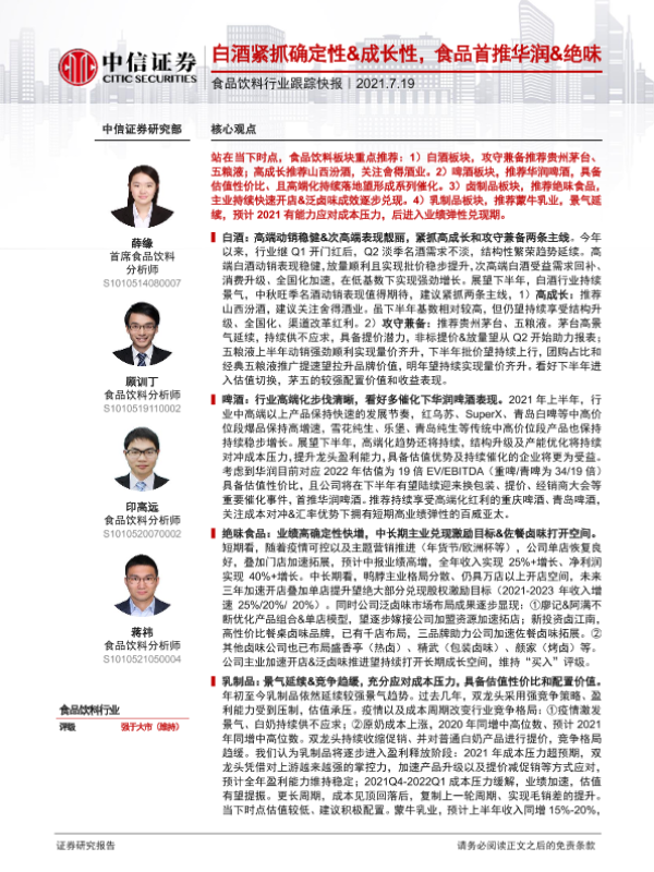 【中信证券】【20210719】食品饮料行业跟踪快报:白酒紧抓确定性&成长性,食品首推华润&绝味-5页