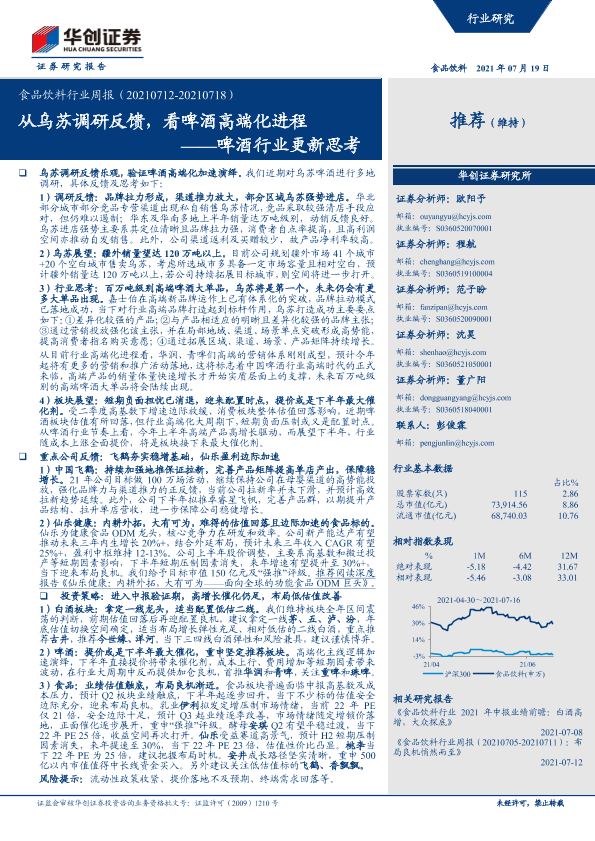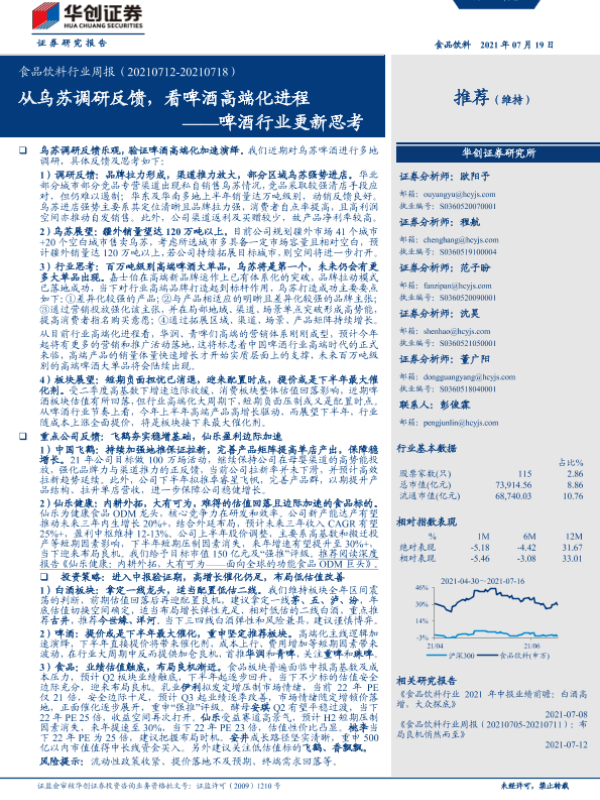 【华创证券】【20210719】食品饮料行业周报:啤酒行业更新思考-从乌苏调研反馈,看啤酒高端化进程-13页