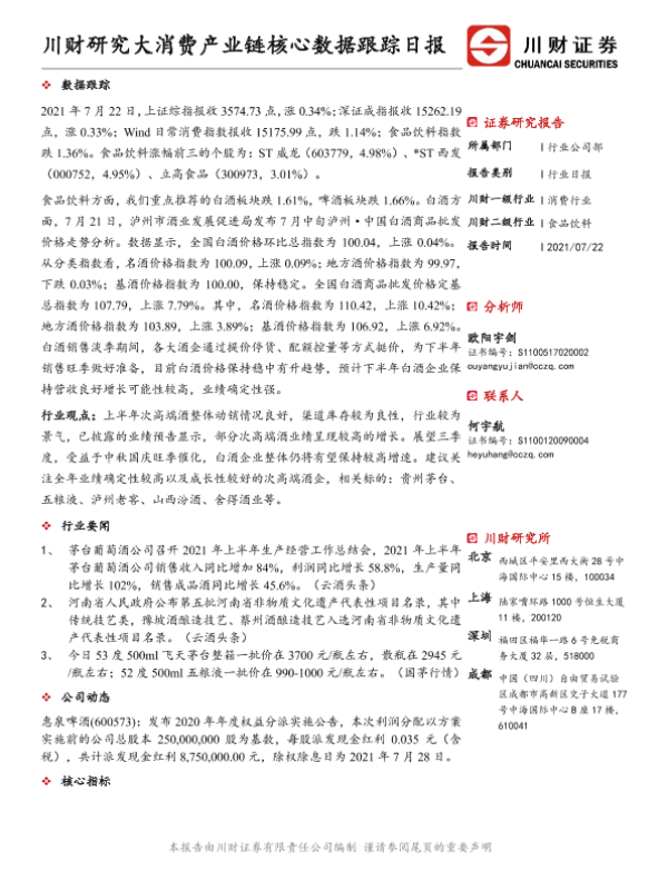 【川财证券】【20210722】食品饮料行业日报:川财研究大消费产业链核心数据跟踪日报-4页