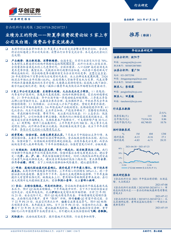 【华创证券】【20210726】20210726-华创证券-食品饮料行业周报:附夏季消费投资论坛5家上市公司及白酒、消费品专家交流要点-业绩为王的阶段-13页
