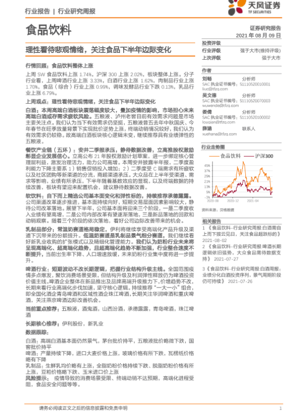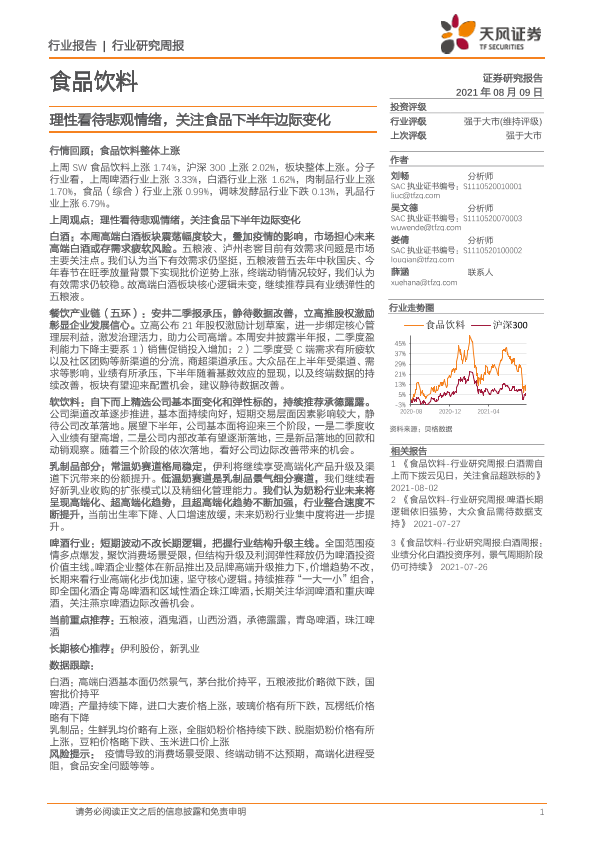 【天风证券】【20210809】食品饮料行业研究周报:理性看待悲观情绪,关注食品下半年边际变化-7页